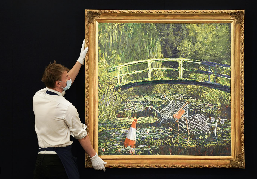 Show Me the Monet isn’t just a parody—it’s a sharp, conceptual intervention. By appropriating one of Western art’s most beloved images, Banksy forces us to confront what society values, what it discards, and how art can be used to reflect and resist cultural decline. The painting was sold in 2020 at Sotheby’s for nearly [£7.6 million](https://www.myartbroker.com/artist-banksy/articles/spotlight-on-banksys-show-me-the-monet), underscoring Banksy’s ascent in the fine art world while reinforcing his ability to challenge its very foundations. The piece remains a key example of how the artist uses appropriation and satire to transform beauty into biting social commentary.